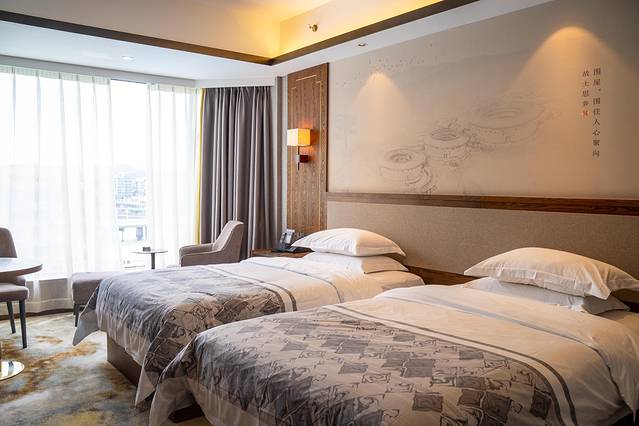 来到客房,客房的布置同样非常的用心,床背景墙上韶关特色的风景画,古色古香的木饰面装饰点缀在整个空间之中,总能给人不一样的入住体验。