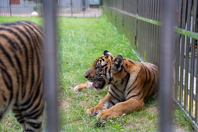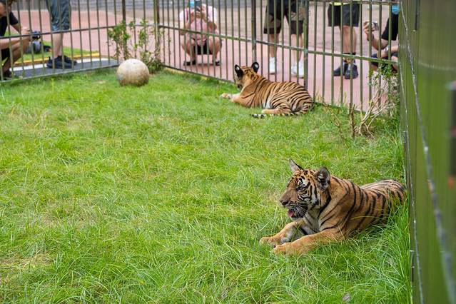 在华南虎园,不仅能看到华南虎,还可以和年幼的小华南虎近距离接触,只是隔着不锈钢的栅栏,三只可爱的华南虎幼崽正躺在草地上看着往来的游人,年幼的它们玩性十足,一会抢篮球玩,一会跟着栅栏外的游客跑,这还是我第一次如此近距离的和老虎互动,这样的多体验也是别有一番趣味。