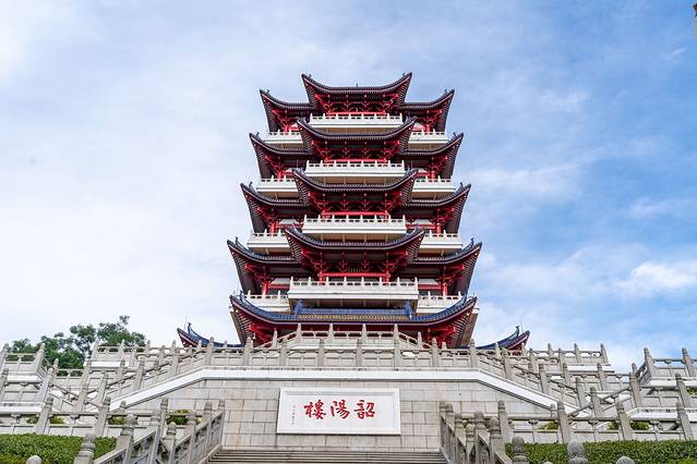 沿着阶梯拾阶而上,从不同的角度欣赏韶阳楼,可谓是一步一景。韶阳楼采用的是唐宋中国古典建筑风格,吻合了韶阳在唐宋时期鼎盛繁华的历史,整体体现了岭南古建筑风格,同时又兼具北方之雄浑和南方之灵秀。
