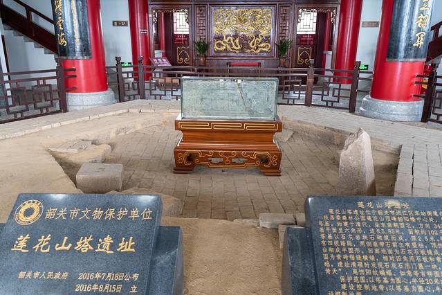 迈过高高的门槛,来到韶阳楼的一楼,一楼展示的是莲花石塔的遗址,历经岁月打磨后斑驳的石块,向我诉说着这里曾经的过往。