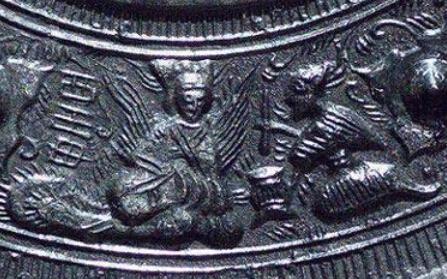东汉 画像镜上的西王母纹饰 西王母双翼有尾 边有羽人捣药(网上图片)