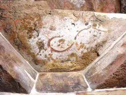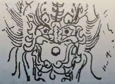 藻井上由凤凰引路,乘龙、驾鹤仙人及飞廉、飞虎和天马等聚集到一位双耳直竖、两眼圆睁,好似闪烁的五角星辰。头上乱发蓬松,有戴胜。中间竖起“王”字,面部睁狞。双臂向下伸出支撑地面,双腿向上分开蹬在抹角石上,张开大嘴露出虎牙,发出震天动地的吼声。胸前露出一对丰满的乳房。四神墓中的壁画有学者认为是神话传说中的西王母。