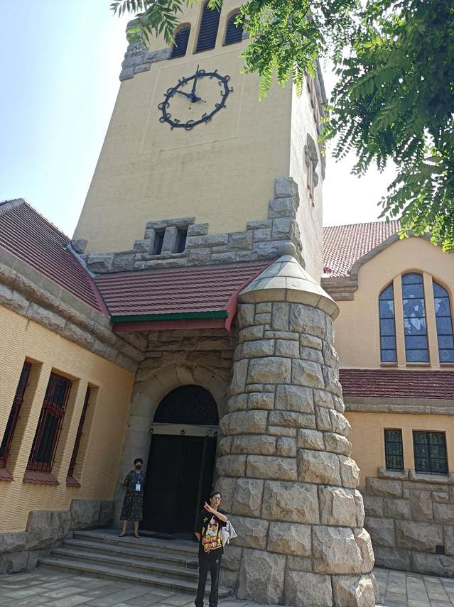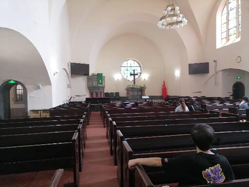 来到江苏路基督教堂,也许来过可能忘却。这次亲临登高钟楼,呤听钟声观海眺望栈桥沿海风景, 不是幸事。忍着热浪拾级而上,从圆形建筑侧门进入,沿旋转楼梯来到三楼--钟楼,那机械式传递,一级带一级,最后击中钟鼓,发出悠远撞击声,久久回荡。从仅有窗户向外看,井底之光,但凉风阵阵,好舒服的。经历沧桑时代钟表,继续完成使命,精密而准确,古时智慧与技术值得学习。来到一楼教堂,宽大空间,高大格局,通透光线,随手摆放居饰,给人心灵之感。整齐清洁一排又一排座椅,层次分明,高低一致,远远向前台看,既遥远又亲切,内心清静无一了,这就要是精粹之柱。