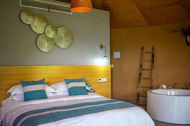 在阳台、走廊、广场上都能看到不同角度的炼丹湖景色