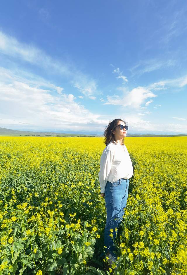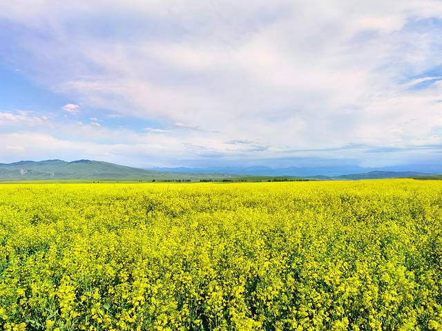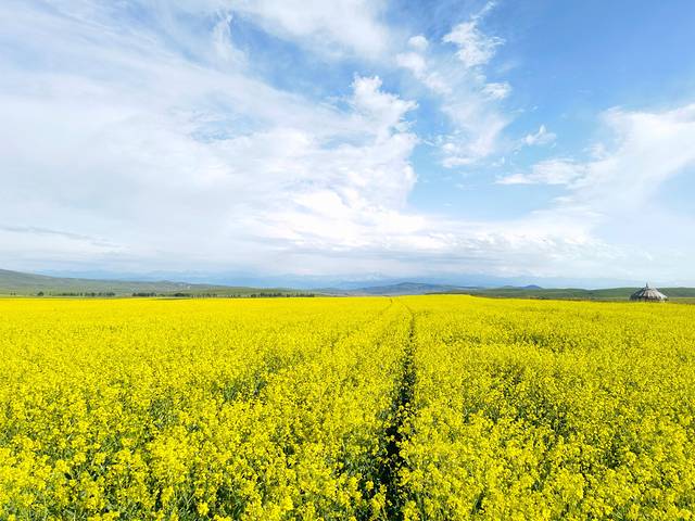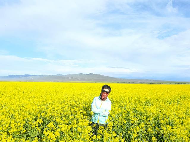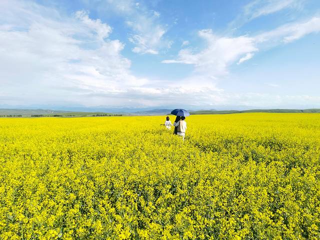 昭苏的油菜花田真是意外之喜,因为出行前没有考虑到7月初是看油菜花的好时节,车子行驶过程中,远处的金黄色成片引入眼帘,霸占视线,不愧号称万亩花海,油菜花竞相绽放,超级惊艳。路上实在忍不住,说要找一个地方停车拍照,某个小伙伴说油菜花到处有,有什么好拍的,我和岚岚说这不同啊,这是成片的万亩油菜花啊,当然某人下车之后真香了,哈哈。