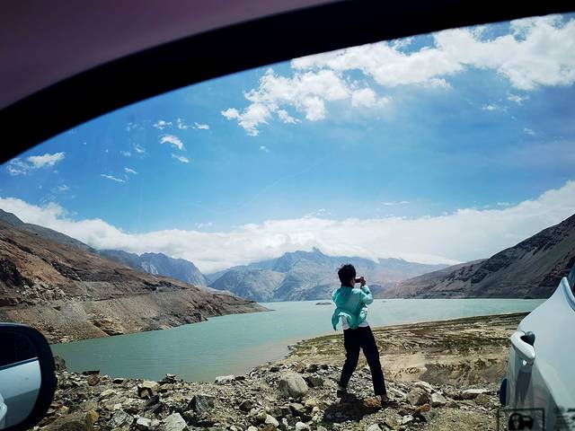 从盘龙古道下来走瓦恰乡会经过下坂地水库,下坂地水库又叫班迪尔蓝湖,属于下坂地水利工程的一部分,水的颜色根据光线和水的深浅变化,我们那天看到的湖面颜色较浅,属于淡粉蓝色吧。