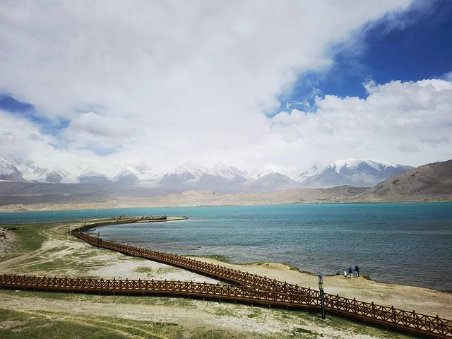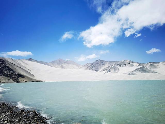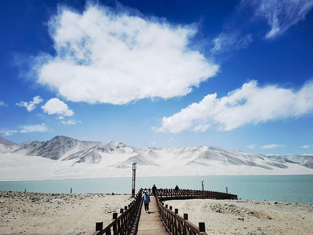 南疆白沙湖位于克州阿克陶县,离喀什约150公里。天气晴朗时,蓝色天空朵朵白云,远处的雪山巍然屹立,湖后的沙丘连绵起伏,浅蓝色湖水微微荡漾,在南疆实属非常清新的景色。最著名的画面应该是在公路上刚看见白沙湖的那个角度拍摄的视频或者照片,是很容易出片的,但实际那个角度很难拍,因为路很窄无法停车,也不好走到路边,感觉有些危险。