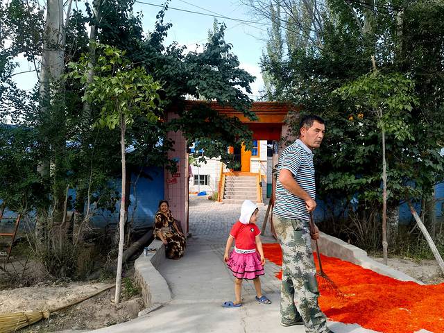 路边很多当地村民在晾晒红花,几乎家家户户都有