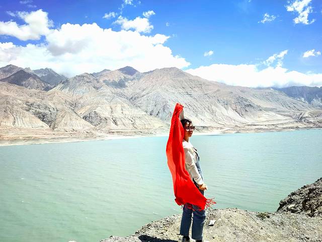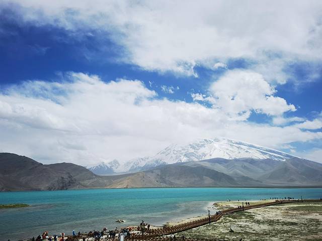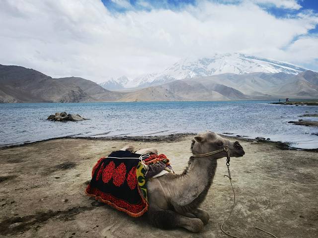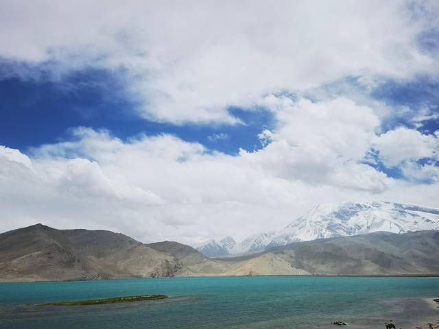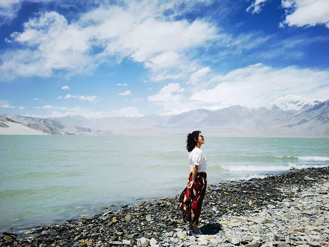 喀拉库勒湖位于帕米尔高原上阿克陶县布伦口乡的慕士塔格、公格尔峰脚下,风平浪静的时候远近山峰倒映水中,犹如画中景。很遗憾我们去的时候风太大了,湖面水波荡漾,倒影看不到了,而且隔得越远宝蓝湖水蓝得越明显,离近了反而觉得有点距离更好看。