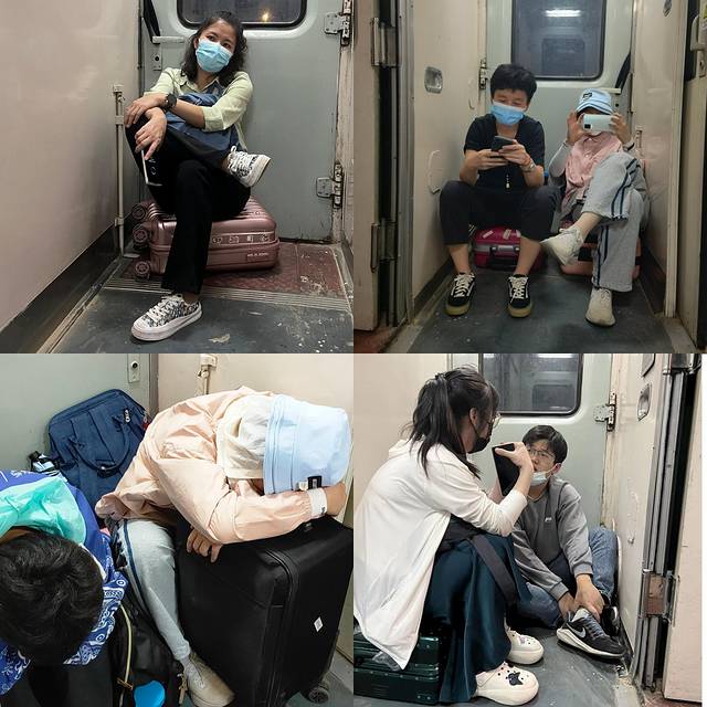 除了好心人让了一个座位给头疼还没有复原的小伙伴,其他人好不容易各自在车厢接头的空隙找到了地板的位置,好心酸,途中有一个五岁的维族小孩和我们聊天,说吃方便面把牙磕着了,牙快掉了,倒霉的不止我们哈。一晚上就这样蜷缩着、蹲着、坐着,靠着熬了十几个小时,睁眼到天亮的滋味真的不好受啊,我觉得这个行程的安排还是略有遗憾,意外让大家都受苦了,不过小伙伴们都安慰我,觉得这是一种难忘也特别的体验,好像又回到了读大学的时候坐火车挤过道的感觉,虽然累,但也许今后没机会体验了,很可爱的朋友们。