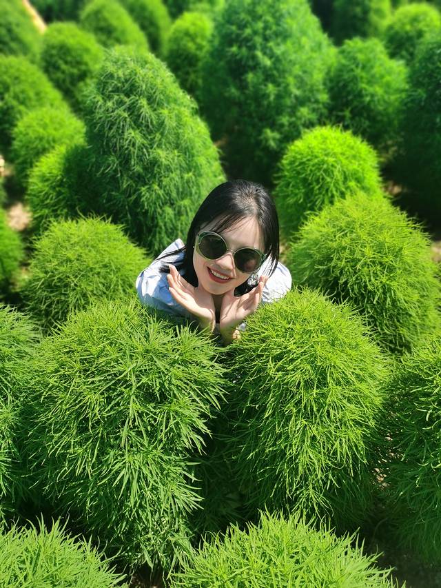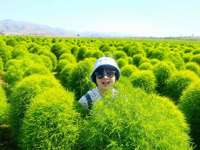 往回走的时候,有一片圆咕隆咚绿油油的植物怪可爱的,工作人员好像说是“扫把树”,后来查了下学名叫做“地肤”。真是太可爱了,忍不住像撸猫一样摸摸,拍照的姿势也不自觉萌起来。