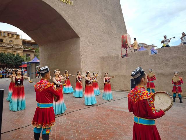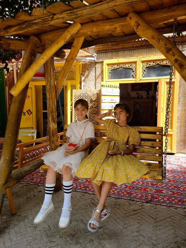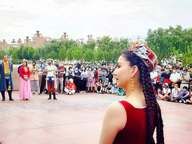 首先去古城东门看开城仪式,7月的时候每天有10:00、12:00、18:00三场表演,可能是我们对表演的期待太高了,实际表演比较短暂,而且内容不够丰富,演员的服化也一般吧,体验感不算很好。然后布袋巷、彩虹巷是人挤人,去找蓝色巷子的路上,经过巴格其巷,偶然遇到一个叫“爷爷的爷爷的爸爸的馕”的馕店,买了一个馕,现做现吃的果然更松软好吃,是这次到新疆吃过最好吃的馕了。百年老茶馆几乎是座无虚席,许多当地人点一壶茶、一些小点心,可以坐上一个下午,聊聊天、弹弹琴、载歌载舞,好不惬意,当然不能对环境有过多的期待。遗憾的是本来每天下午6:00左右可以在百年老茶馆前欣赏驼铃招婿表演,但当天的表演取消了。我和岚岚顶着烈日走在古城的街上,找当地小商品作为纪念品,这是我们多年来旅行的习惯,总要带点当有特色的什么小玩意回家。