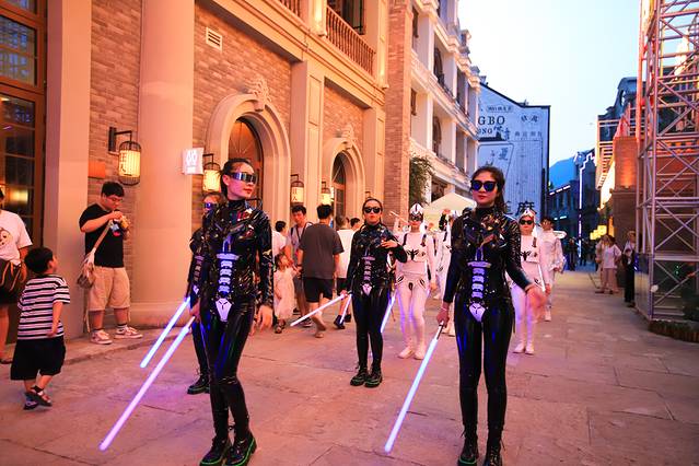 在演出还没开始前景区里还穿着各种服饰的演员巡游演出,沿着街道走都能看到,有穿着充满科幻的衣服,手里拿着道具,非常的精彩。