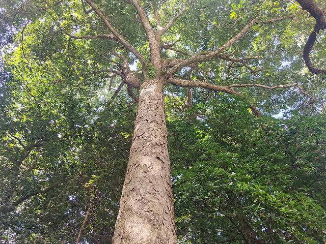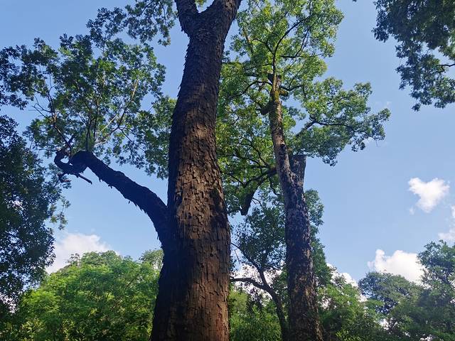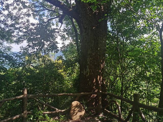 正值炎炎夏日,阳光下人都快要被晒化,进入这片森林后,顿觉暑气全消。钻入树林,这里有一棵楠木王,已经有800多年的树龄,抬头仰望高大笔直的树干,感觉颈椎病已经被治好了。