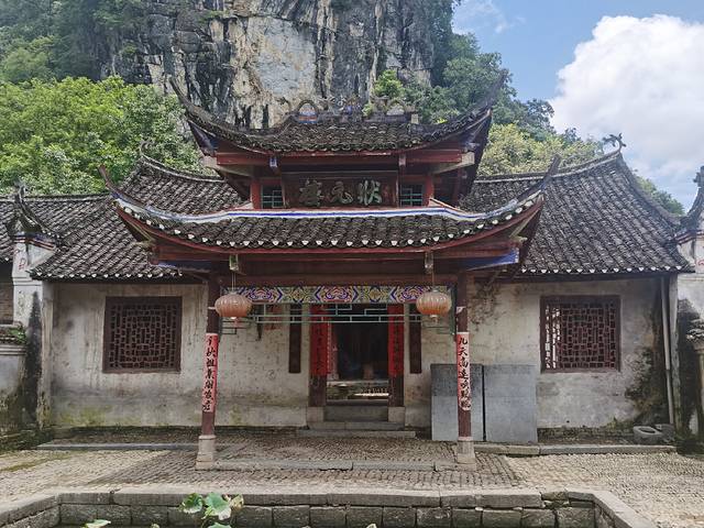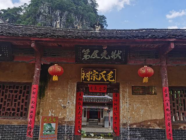毛氏宗祠三进三开间,第二进为状元楼,重檐歇山顶,屋檐上装饰着二龙戏珠,中间悬挂着“状元楼”牌匾,后面就是高耸的秀峰,十分有气势。第三进是祭殿,里面供奉着毛自知的坐像,头戴明式状元帽,一手扶膝,一手释卷,气定神闲。