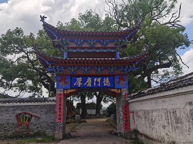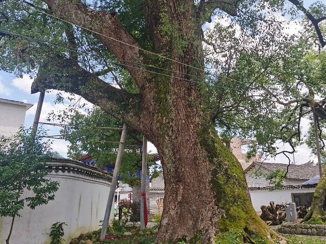 穿过大坪,走过弯弯曲曲的街巷,来到一处大院,院门上写着“德门膺厚”,里面有一个祠堂和一个戏台,最神奇的则是院内的几棵参天古樟树,个个都有几百年的树龄,非几人不能合抱。