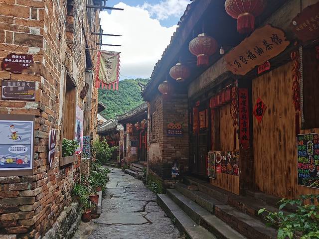 岔山村最初也是个驿站,因为是潇贺古道进入广西后的第一个村子,所以称它为入桂第一村。古村中有一条老街,青石板铺路,两旁都是老房子,大多做成小饭馆的样子,里面摆上几张八仙桌,售卖着当地的特产和小吃,很有年代感,让人忍不住想进去坐一下,打个尖。外面虽然阳光暴晒,屋子里却是十分清凉,甚至不必开空调,有个风扇吹吹就足够了。