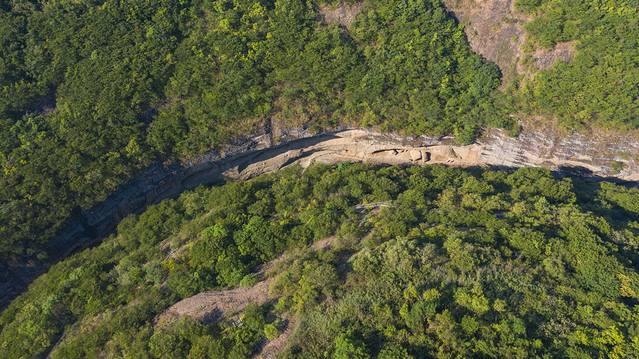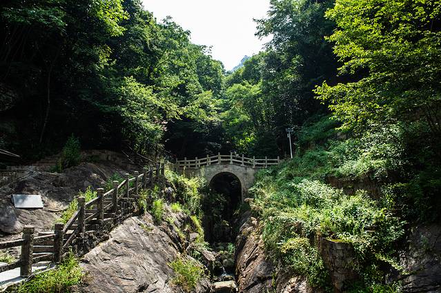 皖西大裂谷,裂谷长约1500米,宽数十米、高十余米,谷坡陡峭,十分罕见。裂谷是由流水沿断裂构造长期侵蚀下切所形成的,洞穴也是因流水溶蚀所致。大自然真是奇妙。