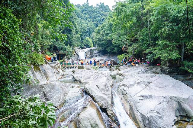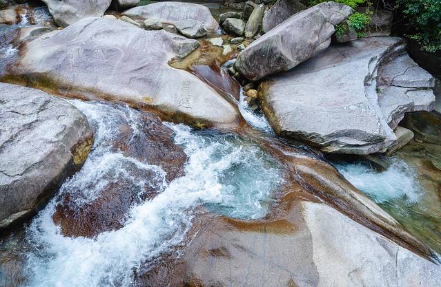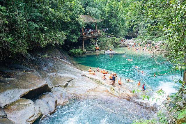 景区有着各种浅滩和水潭,清澈见底的溪水呈献出果冻色,让人看着都想跳下去游上一圈。