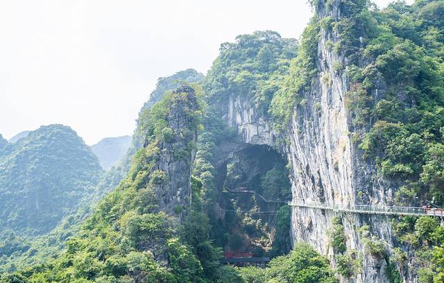 和之前的景区不同,这里能很好的看到广西特有的喀斯特地貌山群,而玻璃栈道从两座山谷间穿过,沿着悬崖峭壁直接进入到山洞内部,此处又叫石门洞开。