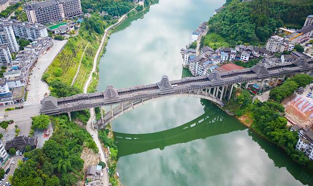 整座桥有7个桥亭,造型精美,它也是世界上长度和规模最大的风雨桥。