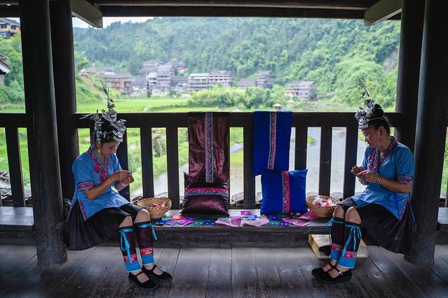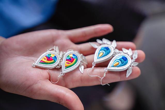 在桥上偶遇侗族的姑娘在做侗绣,很喜欢这个手工的银耳环,颜色鲜艳,样式也很特别。