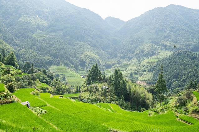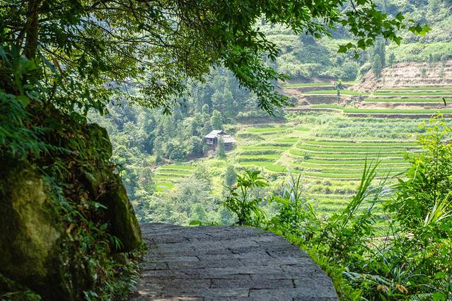 山谷里层层叠叠的梯田,特色的苗族吊脚楼,风景优美,有种进入桃花源的感觉。