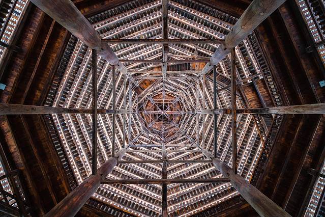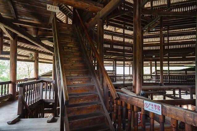 鼓楼内的四根大柱都是百年以上的杉木,在下面看着实壮观,两边还修了木质的楼梯,游客可以登上鼓楼。