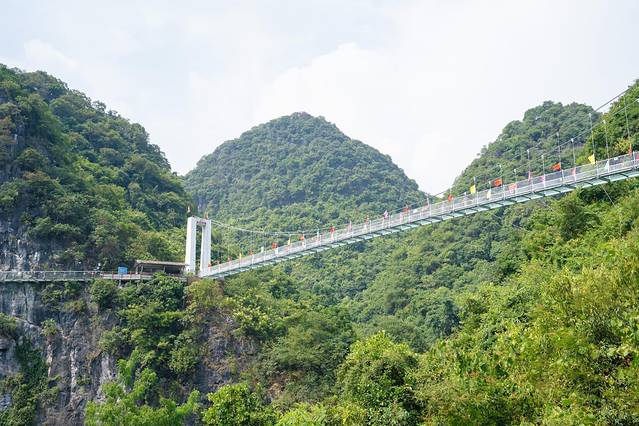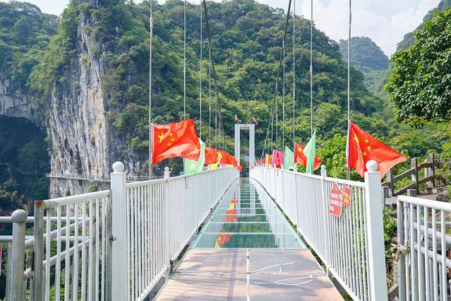 这里有着广西的第一座玻璃栈道,整座桥长二百一十八米,建于悬崖峭壁之间,惊险又刺激。