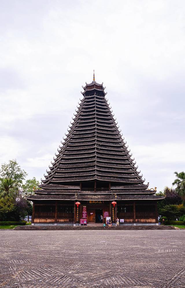 三江鼓楼高42.6米,共有27层,就像一座木质的金字塔一般,层层而上,工艺精湛让人惊叹。