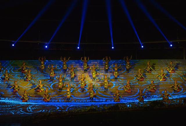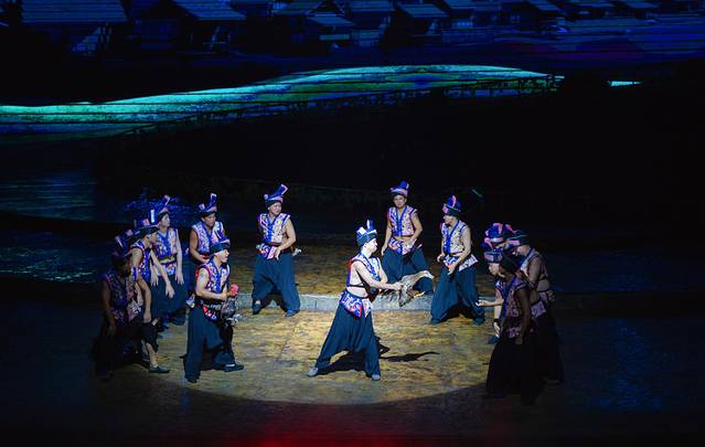 场馆内的布景非常特别,传统的侗族吊脚楼,鼓楼都被融入了舞台。