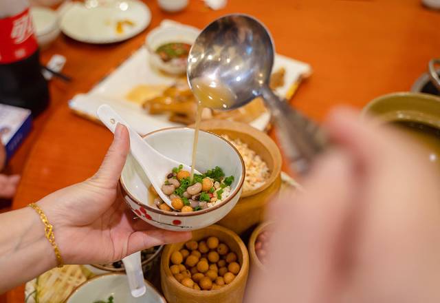 广西油茶,服务员将各种配料端上,可以根据自己的口味选择甜口或者咸口。