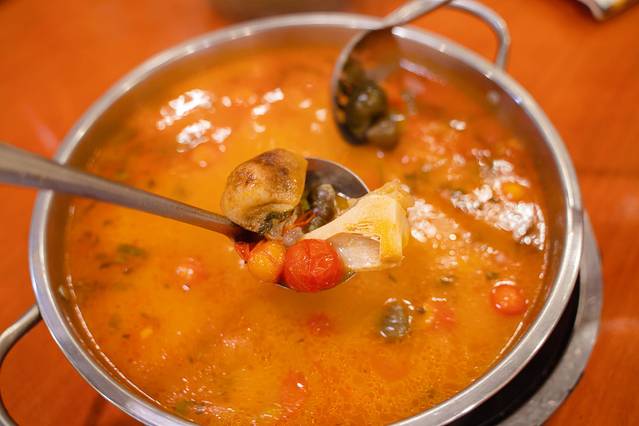 侗族人也喜欢吃酸辣,这里的酸辣汤底绝对不输贵州,酸辣牛蹄筋里加了小番茄,酸味浓还一口爆浆。螺蛳和木姜子的风味给味蕾刺激,酸酸的辣辣真的太好吃了。