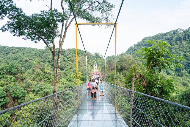 走在玻璃栈道上觉得超刺激了,透明的玻璃将瀑布泉水与山川草木尽收眼底,桥上还有穿民族服饰的小姐姐和你合影。