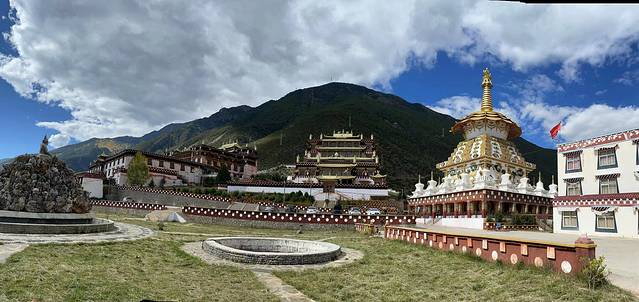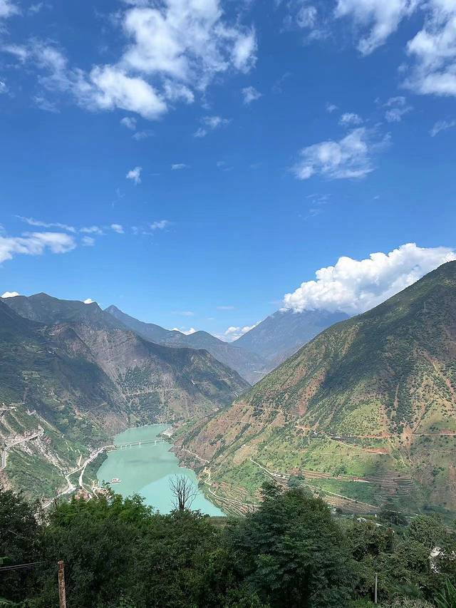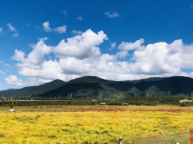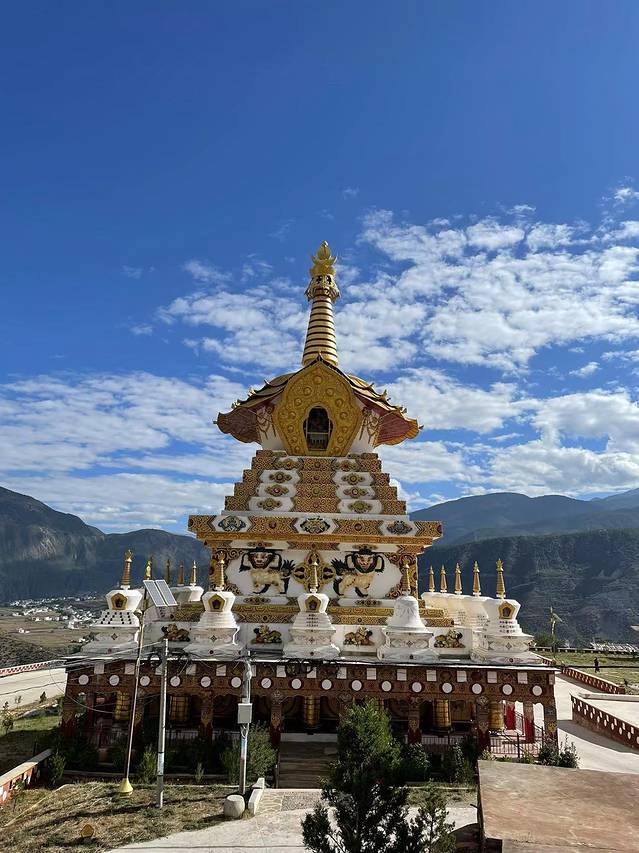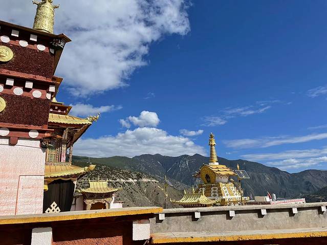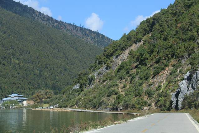 早上参观位于乡城县山顶上的桑坡岭寺,主殿有33米高宗喀巴大师本尊像,威武庄严。在寺庙前可以俯瞰整个县城。然后出发前往香格里拉古城,途经青德镇,东旺乡,瓦卡乡奔子栏,纳帕海等地。在经过青德镇的某个村子时,我们被村民自家种的伸出院墙的小青苹果吸引了,悄悄的摘了一个尝了一口,真甜呀,于是把车停在路边,敲人家的门,问苹果能不能卖。主人大哥热情地把我们迎进了院子,让我们自己摘,没想到后院还有好多梨树,看相不怎么好的苹果和梨都很甘甜,可能跟高原的日照充分有关,吃到的水果都特别甜。今日行程的亮点当属金沙江大峡谷和金沙江大拐弯。在金沙江大峡谷,我们几个像孩子一样的呐喊接龙,聆听山谷的回声,领略水的静谧和山的巍峨。开着车在山腰上穿行,路是坑洼不平的石子路,一路看到很多落石和山体滑坡,一定要小心驾驶。金沙江大拐弯也称金沙江第一湾,位于四川德荣县,是四川与云南的分界线,江的对面便是四川,相当于站在云南看四川。这里高山深谷,层峦叠嶂,站在观景台上看,浩浩荡荡的金沙江穿山越谷而来,在即将冲破这滇川要塞之时,似乎想舒缓一下长途奔波的疲劳,于是放慢脚步,围绕着这金字塔似的山峰画了一个U型的弧线,于是便造就了这处地理奇观。相机拍不出它的美,更拍不出它的壮观。路过纳帕海时尝试了下水上公路,没有过瘾,因天色渐晚先去了独克宗古城,夜宿心中日月别苑。
