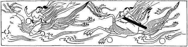 东北绘人身龙尾的伏羲、女娲神像,女娲居左,散发,穿尖领绿色羽衣,腰系褐色兜巾,双手将白色圆月举过头顶,月中蟾蜍已脱落不见;伏羲居右;穿尖领褐色羽衣,腰系绿色兜巾,双手将褐色太阳举过头顶,日中有左向三足鸟,在伏羲与女娲间,有数株菩提树。