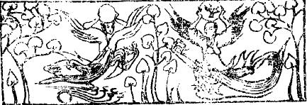 2、四神图像占据四壁重要位置,四神周围以曲技忍冬与变形莲花、火焰纹样组合成四方连续图案作地托衬,一幅壮观辉煌图景呈现在面前。墓室四隅处有辟邪怪兽(方相氏)托龙顶梁,更啬了神秘感。仰望墓顶。神仙在神龙仙禽相伴下游荡在日月星云之间或处在菩提树下带领我们进入一个神话世界里。