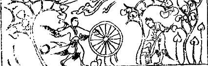 西南抹角石上,绘冶轮人,轮置架上,轮左右各有一人,披发,左侧穿尖领绿色长羽衣,红领,腰系褐色兜巾,足登黑履,以左手扶轮,右手抡锤敲打,右者站在菩提树下,穿尖领褐色长羽衣,绿领,躬身操作。左手似拿一只铁钉,为制造车轮之用。