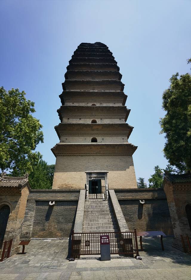 小雁塔建于唐景龙年间(公元707年),是为了安置印度取经归来的“高僧义净”翻译佛经而建。初建时为十五层, 后因遭遇多次地震,现在仅存十三层。塔的内部有木梯,盘旋而上可达塔顶。