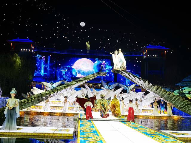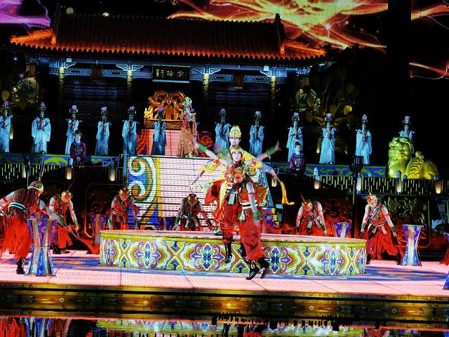 大型山水历史舞剧《长恨歌》根据白居易的同名叙事长诗改编,由300多名专业演员身着华丽的唐服出演,用舞蹈展现诗中记叙的经典桥段:盛唐时期,唐明皇召杨玉环入宫,至爱至宠。安禄山叛乱后,杨玉环在马嵬坡被逼迫而死,明皇肝肠寸断,最终魂魄升天,与爱妃在月宫相会。