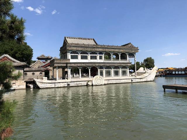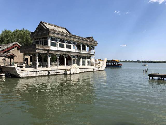 清晏舫俗称石舫, 在长廊西端湖边,是一条大石船,寓“海清河晏”之意,是颐和园唯一带有西洋风格的建筑。