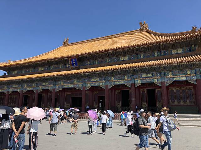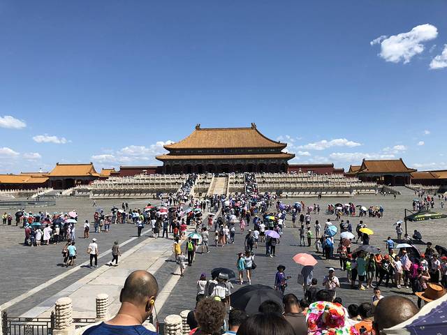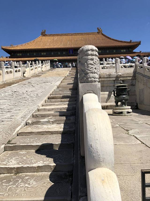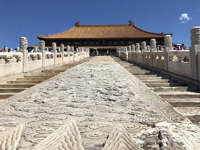 太和殿是紫禁城内体量最大、等级最高的建筑物,建筑规制之高,装饰手法之精,堪列中国古代建筑之首。耸立在眼前的这座金碧辉煌的宫殿,蓝天下黄色的琉璃瓦闪闪发光。层层叠叠的汉白玉石栏杆,烘托起这座流光溢彩的宝殿,真是宏伟壮观美不胜收。