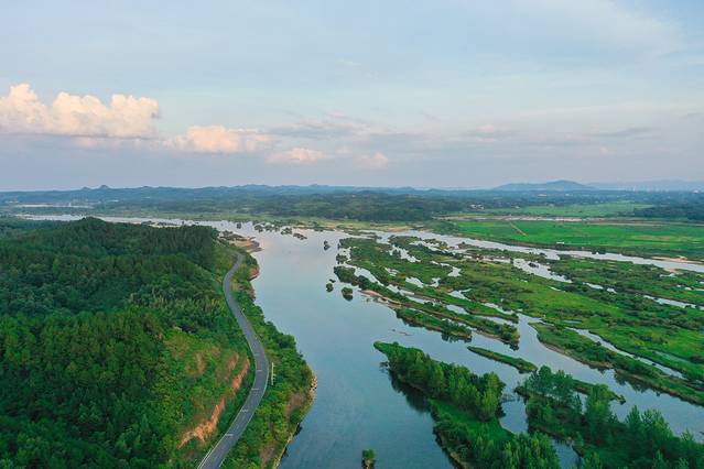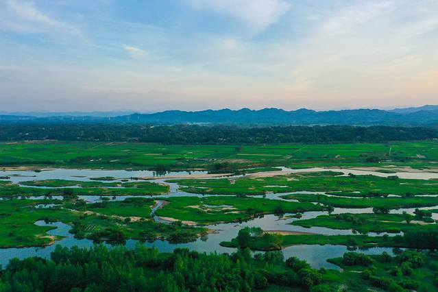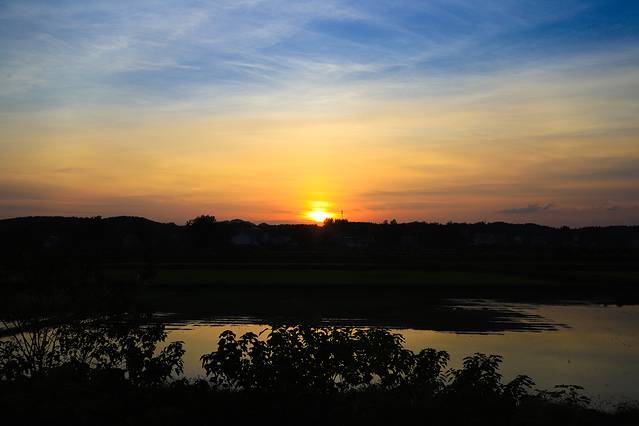 傍晚开车自驾前往大别山风景道裕安段,在路上遇见醉美日落,太阳刚要落山的时候,落日的余晖照射在田地上,水中倒映着夕阳金光闪闪。夕阳无限好,只是近黄昏。公路的一边是树林,另一边是湿地公园,这里的景色美如画,宛如一幅美丽的风景画。让人流连忘返。