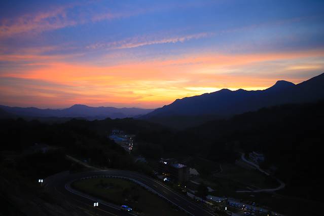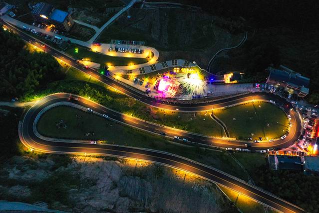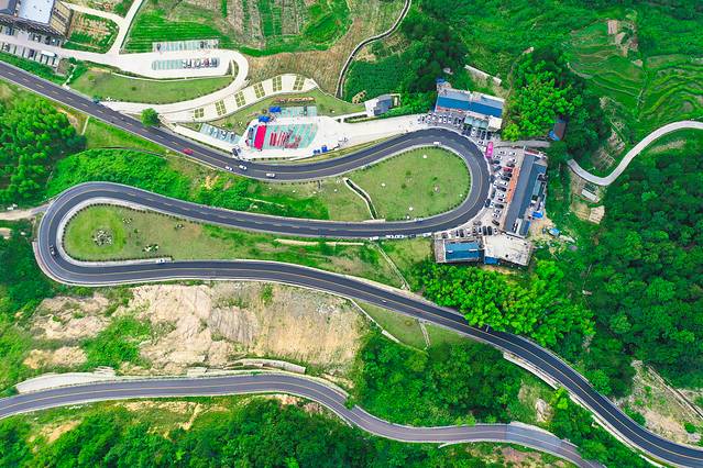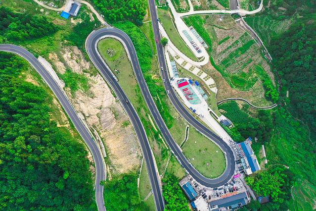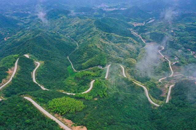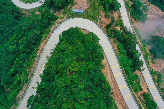 向远处望去众山重叠、由远及近共九重山,也因此得名“望九重”。 一路向下,山路盘旋,路况也是极好的,两边随处可见各种农家乐,经过一个又一个弯道,来到沿途的经典之处--8字弯,有一个太阳乡梦旅工厂的牌子,这里是很多机车爱好者的压弯圣地。自驾的这几天每天都有美丽的夕阳和晚霞相伴,自驾800公里大别山风景道,每一道都是风景,值得你来打卡。