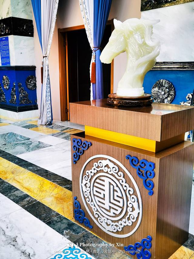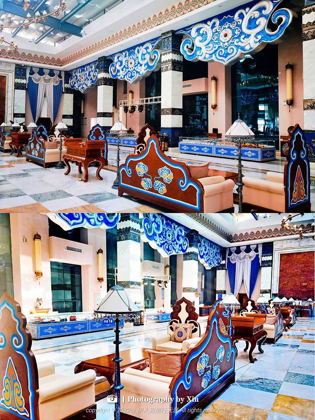 作为建筑设计美学爱好者,走进酒店就被整体设计所吸引,1500平米气度非凡金碧辉煌的酒店大堂,一梁一柱,一帛一画,无不包含当地特色元素,总服务台背景是由一块铜镶嵌而成,图案有平顶山、锡林河、蒙古包等组成,是锡林郭勒草原的缩影,整体看上去磅礴大气,尽显气质,细微之处更是体验了独具匠心!