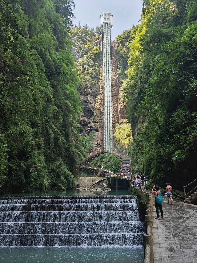 这是进入阿依河景区的垂直电梯,设计高度180米,运行高度148米。上行或者下行35元/人,上下行50元/人