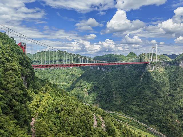 矮寨大桥位于德夯大峡谷之上,吉首市西北角的包头—茂名高速公路桥。2012年3月底通车运营,