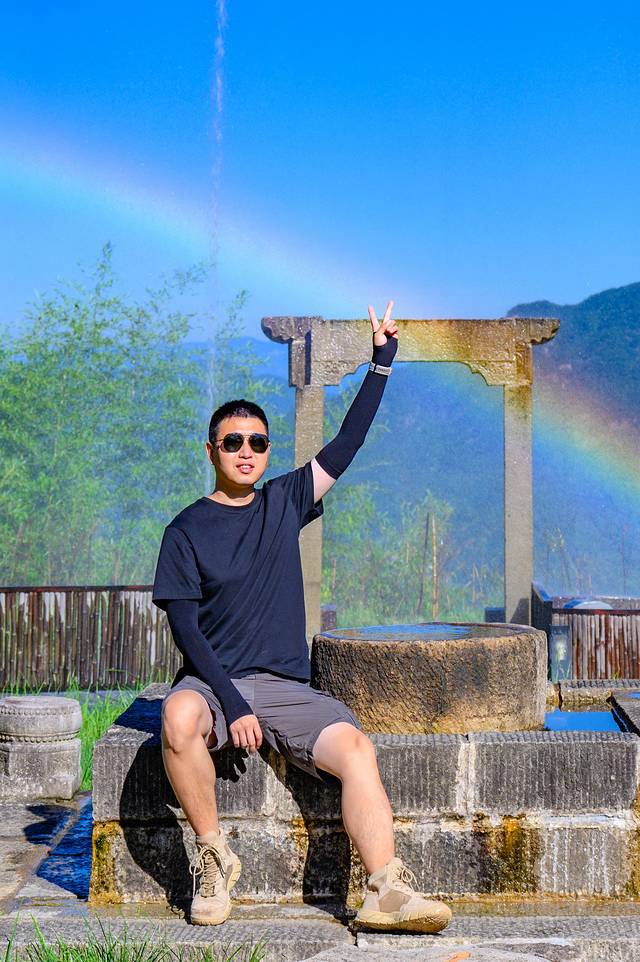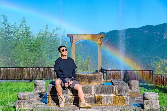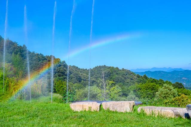 建议向我们一样一早开始登山,这个时候的气温相对较低,且负氧离子含量最高,整个人都神清气爽。而且在白马尖山庄的门前,每天早上都有有一面水幕,倒映出彩虹,是当地的网红打卡点。随着太阳的变化,彩虹也会越来越低,直到消失。