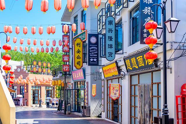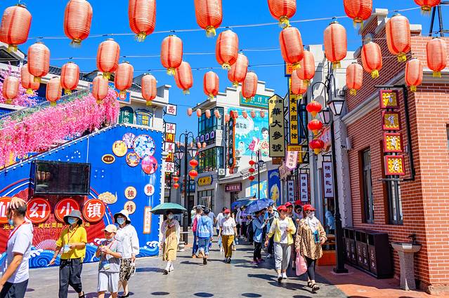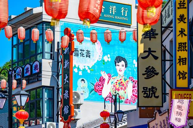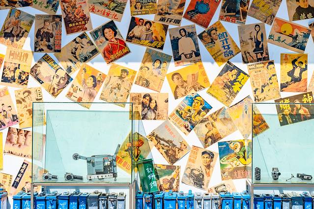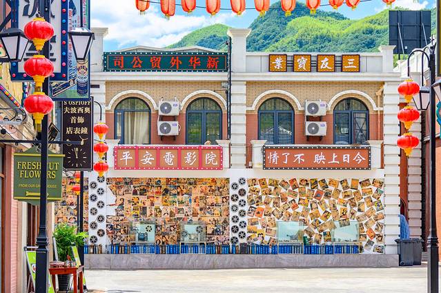 电影小镇是以民国建筑为基调,并且融入了一些当地的皖西风土人情,置身其中给我一种非常沉浸的游玩体验。在这里逛店铺、品尝特色小吃绝对是正经事。歇脚之后便可以在电影场景一样的小镇里拍照打卡。因为霍山是革命老区,发现了一面电影海报墙,上面也基本上都是抗战老电影,看的我是回忆满满。