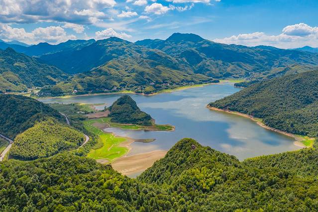 那么屋脊山的看点在哪里呢?前面说了霍山有着“中国好水”优秀水源地的美誉,屋脊山也是山水相依,登山后看见的湖水才是精髓所在。如若是清晨等日出、云海那就更棒了!我也在空地处找了一个好位置航拍,这样取景角度就更加丰富了一些。虽然来的时候是下午,但云层带来的光影,也让风景变得很有立体感。